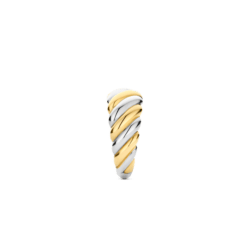 Este anel hipnotizante, com suas faixas entrelaçadas em ouro amarelo e prata, cria um efeito dinâmico e escultural.