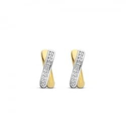 Estes brincos exibem dois círculos refinados: um banhado a ouro e o outro cravejado com zircônias cúbicas brancas.