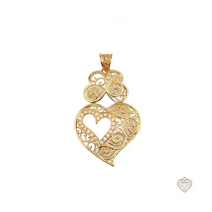 Pendente com inspiração no design tradicional de filigrana portuguesa, ideal para destacar o visual com um toque distinto. Detalhes cuidadosamente trabalhados que captam a luz e acrescentam um brilho subtil, complementados por zircónias. Prático com possíbilidade de aplicar numa corrente ou fio à escolha, tornando-o versátil e adaptável a diferentes estilos.