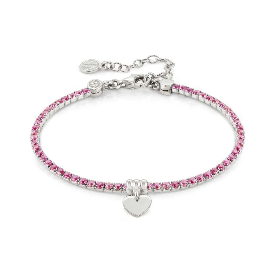 Pulseira refinada em prata, com um pendente em forma de coração. Peça cravejada com pedras de zicórnia rosa. Pulseira que embeleza o pulso com um toque moderno. Leveza, elegância e estilo para qualquer ocasião.